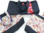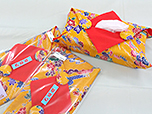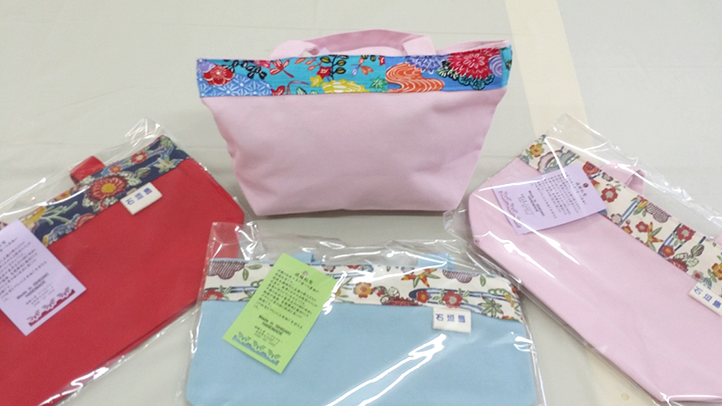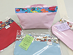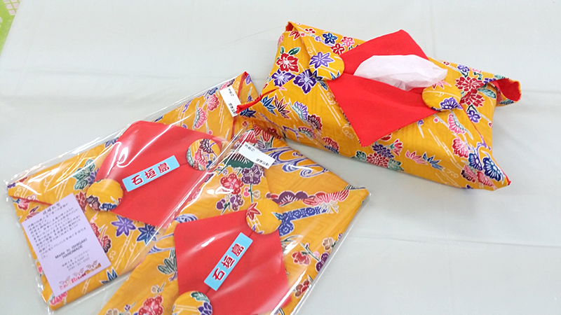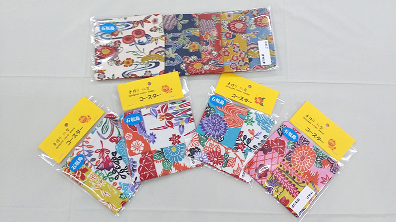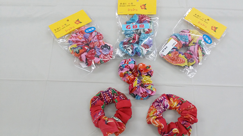 琉球柄の生地と紅型生地でひとつひとつ当店で手作りした銀型グッズができました。女性用に、シュシュやかわいいミニトートバッグ、国産帆布で作ったバッグ。実用品にはコースターやティッシュケース、また三線の持ち運び用カバーもあります。石垣島の旅の記念にいかがですか。当店のほかにやいま村でも一部販売しています。「体験工房ご利用のかたは、10%OFF」