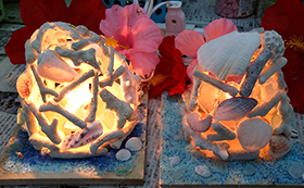 | 内 容 | サンゴ、ビーチグラス、カラーストーン等でランプシェードを作ります。お部屋に飾ると南の島のムード満点です! |